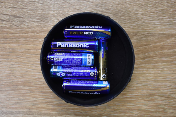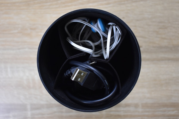 それでは、早速使ってみましょう。メインスペースを4分割にして充電ケーブルを入れた結果、仕切りのおかげできれいに収納できました。サブスペースには電池が丁度よく納まります。絡まりやすいケーブルや大きいアダプター類はメインスペース、電池・SDカードなどの小物はサブスペースに分けるのがよさそう。