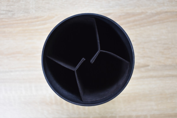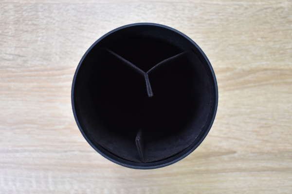 “たくさん収納する”よりも“きれいに収納する”ことに特化した同商品。蓋を開けると、メインスペースに黒色の“可動式仕切り”がお目見えします。この仕切りを1つだけ中央に引っ張ることで、Y字型の収納スペースを作成可能。2つともY字型にすれば、4つの収納場所が確保されました。収納物に合わせてスペースを0〜4分割できるのは嬉しいですね。