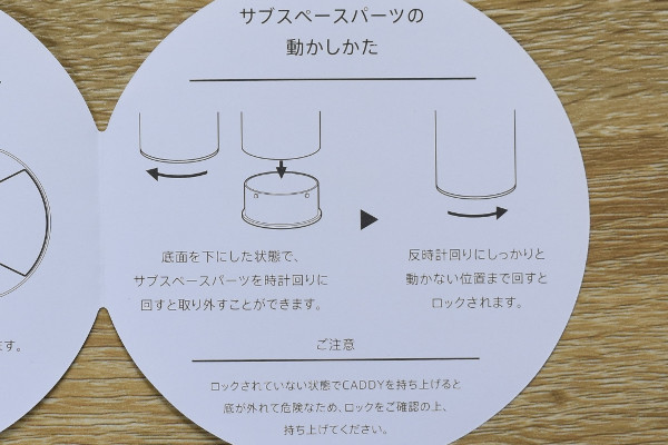 キャディーの魅力的ポイントは可動式仕切りだけではありません。実は“回転ロック式シークレットボックス”という構造を採用しています。底面を下に向けた状態で時計回りに動かすと、内寸83×83×24mmのサブスペースパーツが出現。底が若干浅めなので、手のひらサイズの小物を入れるのにピッタリです。