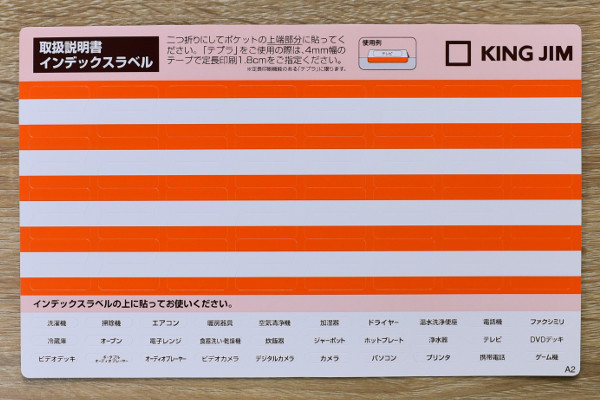 最後のポイントが、検索・分類に便利なインデックスラベル。洗濯機や掃除機などの定番家電製品はもちろん、ゲーム機などのアイテムまで幅広く用意されています。日常で使う家電はほぼ揃っているため、これならテプラでインデックスを作る手間が省けるかも。