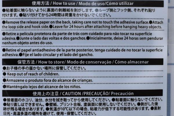 「面ファスナー」はふわっとした柔らかいものと、多少硬めのものとでワンセットです。まずは柔らかいファスナー裏側の白い紙をはがしたところ、透明なテープがお目見え。そのまま壁に“ピタッ”と貼りついてくれます。壁に穴を空けることもなく、傷つかないのはうれしいポイント。粘着力も強力で、ちょっとやそっと引っ張る程度でははがれません。