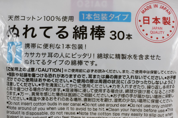 耳掃除の際、耳かきを使うと耳が痛くなることってありますよね。そこで今回はダイソーで購入してきた「ぬれてる綿棒」をピックアップ。1本ずつ包装された、最初から濡れている綿棒です。
