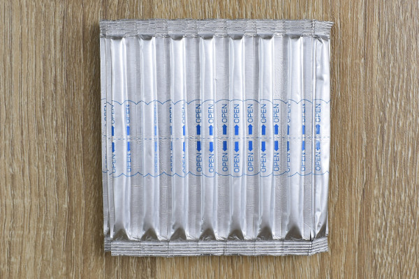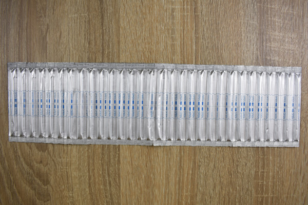 パッケージから取り出してみると、何やら銀色に光る物体がお目見え。個包装タイプの綿棒が、ズラッと30本連なっています。