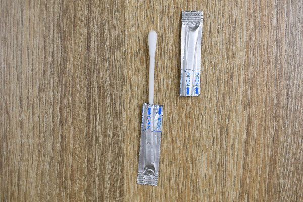 ひとつ切り離して袋を開けたところ、しっとりと湿った綿棒が出てきました。綿棒には純度の高い精製水が使われているため、衛生面は安心ですね。