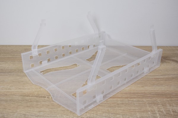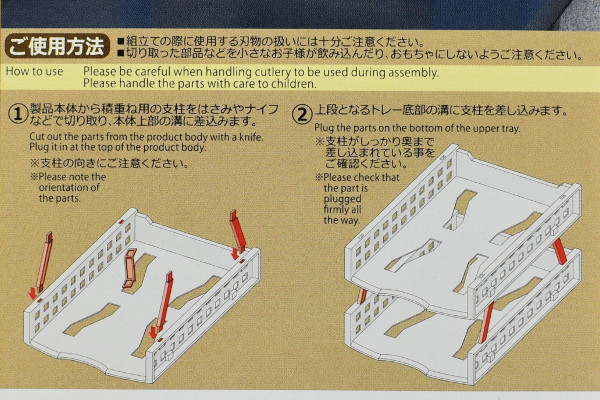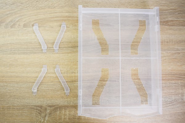 パッと見ただけでは普通のトレーと変わりませんが、底面にはプラモデルのように支柱が4本埋め込まれていました。ハサミでパキッと支柱を取り外してトレーの溝に差し込むだけで、簡単に取りつけることができます。もう1セット上から取りつければ、あっという間に2段式のケースが完成! 十分な高さがあるため、350mlの缶なども入れることができますよ。