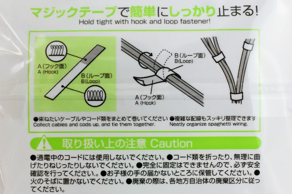 材質はナイロンで作られており、“フック面”はザラザラで“ループ面”はフワフワな触り心地。使い方はとってもシンプルで、ケーブルやコードにタイを巻きつけてまとめるだけ。それでは、さっそく使ってみましょう。