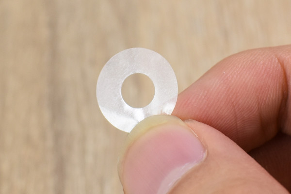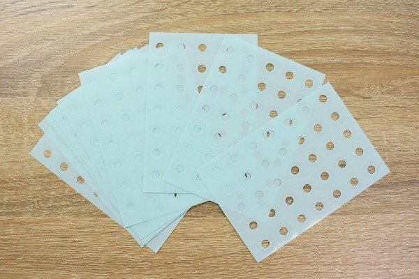 パッケージの中には、穴のあいた水色のはくり紙が10枚入っています。穴の周りにはドーナツ型のシールがついており、その数なんと350片。シールの外形は約14.5mmで、穴径は6mmほどです。