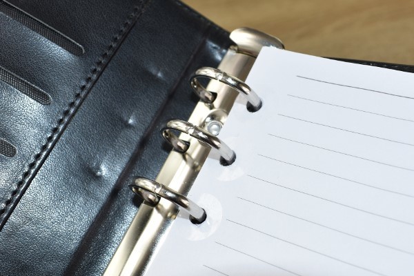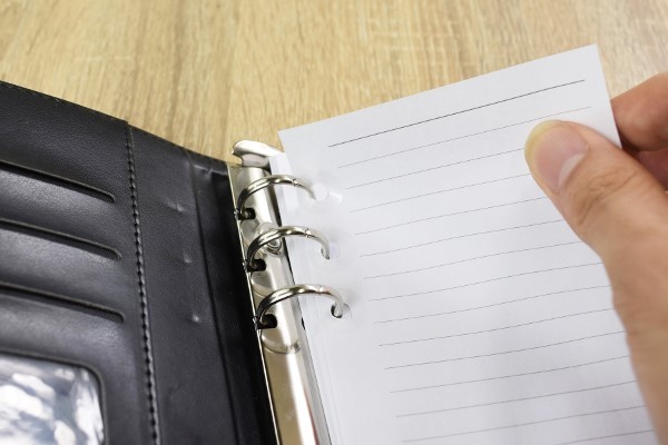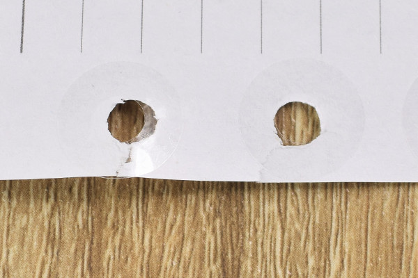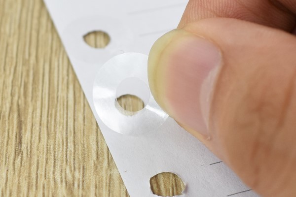 使い方は紙類の穴に合わせてシールを貼りつけるだけ。それでは、早速使い勝手を検証します。試しに紙類へ使ってみると、ピッタリ貼りついてとじ穴をきれいに補強できました。貼った跡が目立たず、破れたとじ穴もしっかり補修できるのは嬉しいポイントです。リング手帳にとじて引っ張っても、破れることはありません。