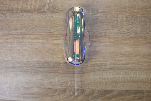 同商品のサイズは、約7.5cm(直径)×31cm(縦)ぐらいのコンパクトな大きさ。透明なスティックには何本もの“ホログラム”がついており、虹のようにキラキラと輝いています。“ホログラムPET”、“アクリル”といった軽い素材で作られていて、ホログラムの中にはゴールドカラーの鈴がついていました。透明の筒にスティックが入っているため、ホログラムがバラバラになることはなさそうですね。