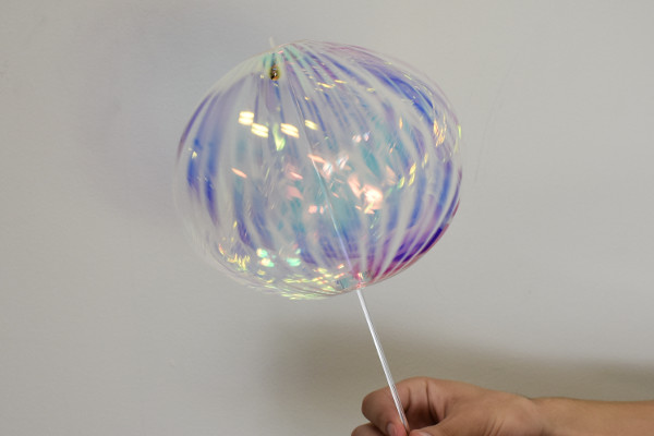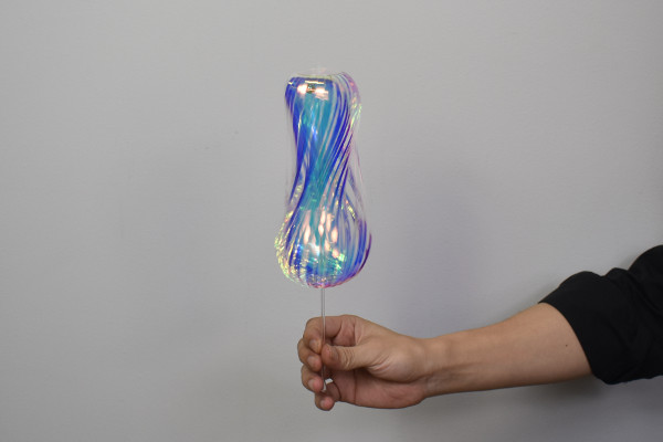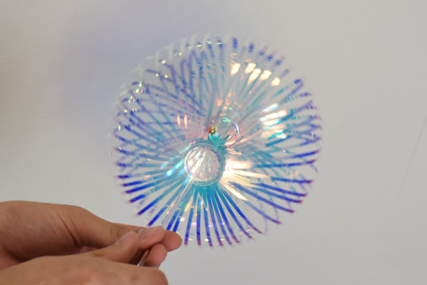 それでは、実際にレインボースティックで遊んでいきましょう。使い方はとてもシンプルで、スティックを回転させるだけ。細いスティック部分を回してみると、遠心力によりホログラムがシャボン玉のように丸く変形します。ふんわり広がるホログラムと共に鈴の音色が聴こえるので、体の力が抜けてリラックスできるかも。