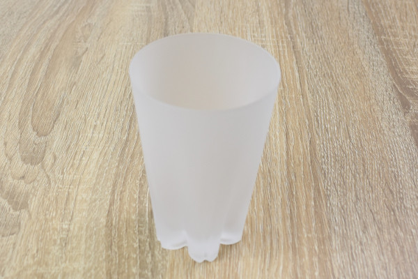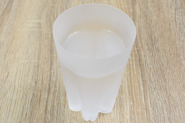 フィルムを外すと白っぽいカラーリングのグラスがお目見え。全体の大きさは約11(高さ)×7.2cm(直径)ほどで、思っていた以上にサラサラとした手触りです。グラスの中には240ccぐらい注げるので、氷を入れてお酒を飲む時にピッタリ。オシャレな形をしているため、友人にプレゼントしてもきっと喜んでくれるはず。