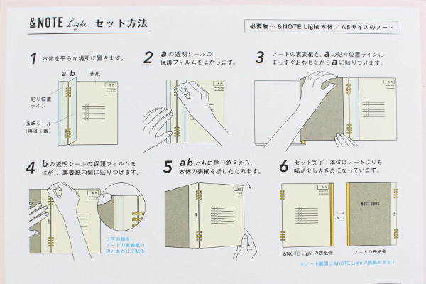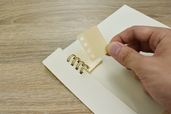 それでは、実際にノートを取りつけていきましょう。使い方はとてもシンプルで、専用パーツの透明なテープをめくってA5ノートの裏表紙に貼りつけるだけ。ノートに合わせるラインがあるため、不器用な私でもまっすぐノートをセットすることができました。ノートは専用パーツをテープでサンドする仕組みです。思っていた以上にガッチリ固定されており、本体から外れる心配もありません。