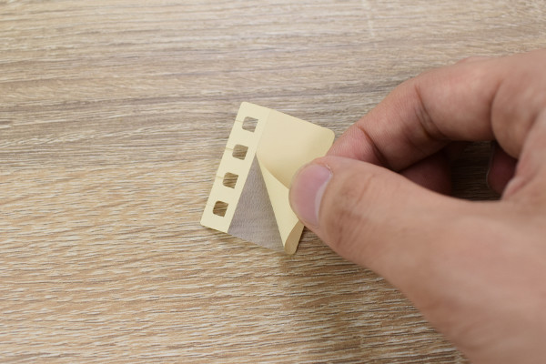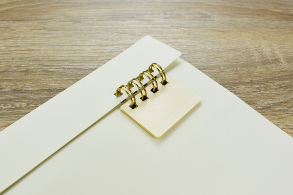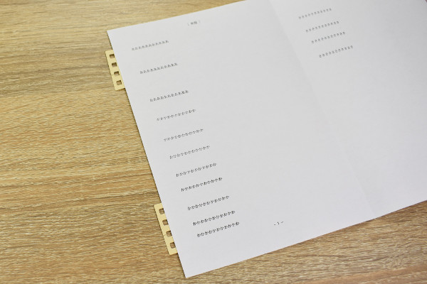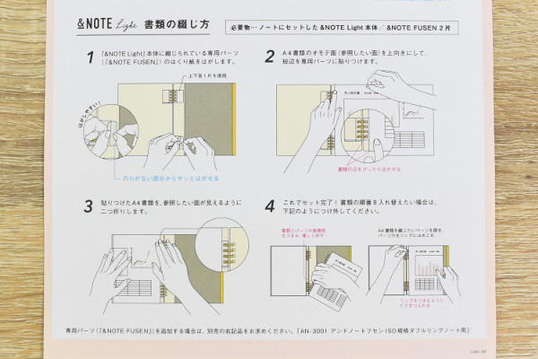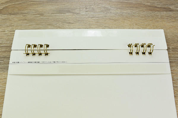 今度は書類を専用パーツ「&NOTE FUSEN」に取りつけてみると、こちらも透明なテープで簡単に綴じられました。A4サイズの書類でも2つ折りにすることで、本体からはみ出すこともなくキレイな見た目に。「アンドノートフセン」は、閉じ穴にうっすら切れ目が入っており、自由にページを動かして使えるところもポイントです。ページを差し替えたい場合や不要になった時に重宝するかも。