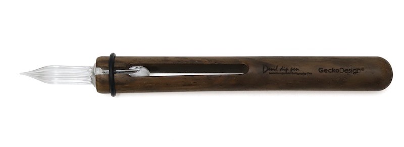 構造は、木製の軸にガラス製のペン先をはめ込んだだけ、と非常に単純。ただ、ガラスの繊細さと木軸の素朴な力強さが同居するデザインはさすが、個性的なインク瓶などで知られるGeckoDesignだけはある、といった感じ。