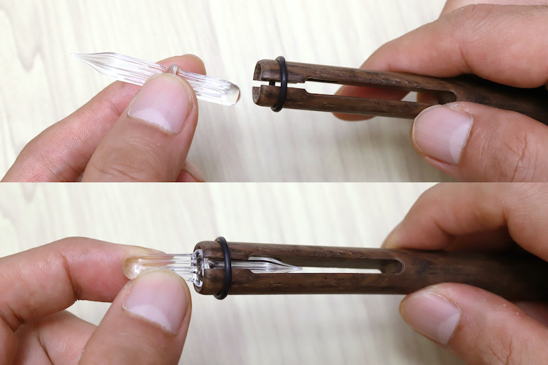 持ち運ぶためのギミックも単純で、ガラスペン先を外して、逆向きにして木軸に差し戻すだけ。「あ、なーんだ」というレベルの単純さである。