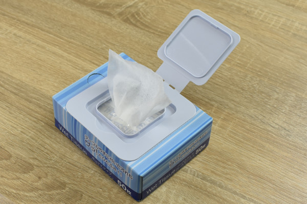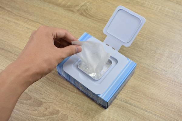 ポリエステル製の蓋を開けると、ウェットティッシュの取り出し口がお目見え。白色のシールをはがせば、すぐに使えるようになります。それでは、さっそく使い心地を検証してみましょう。