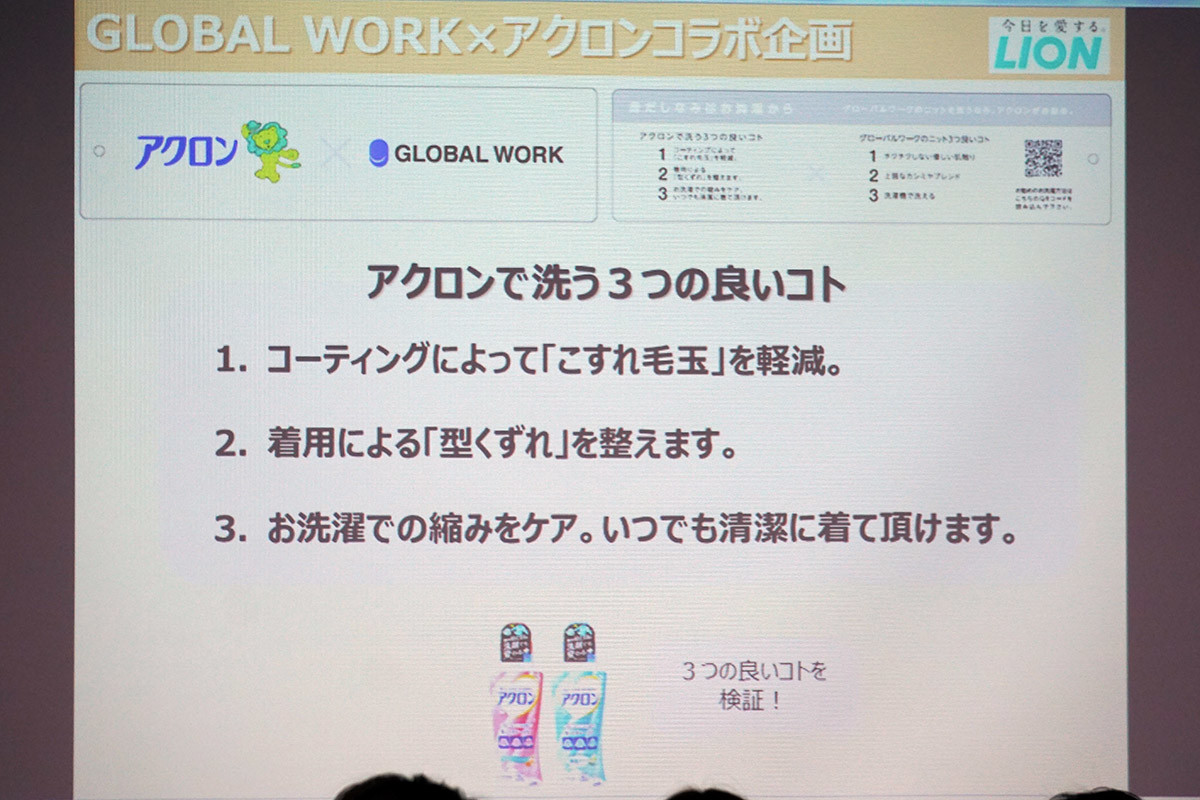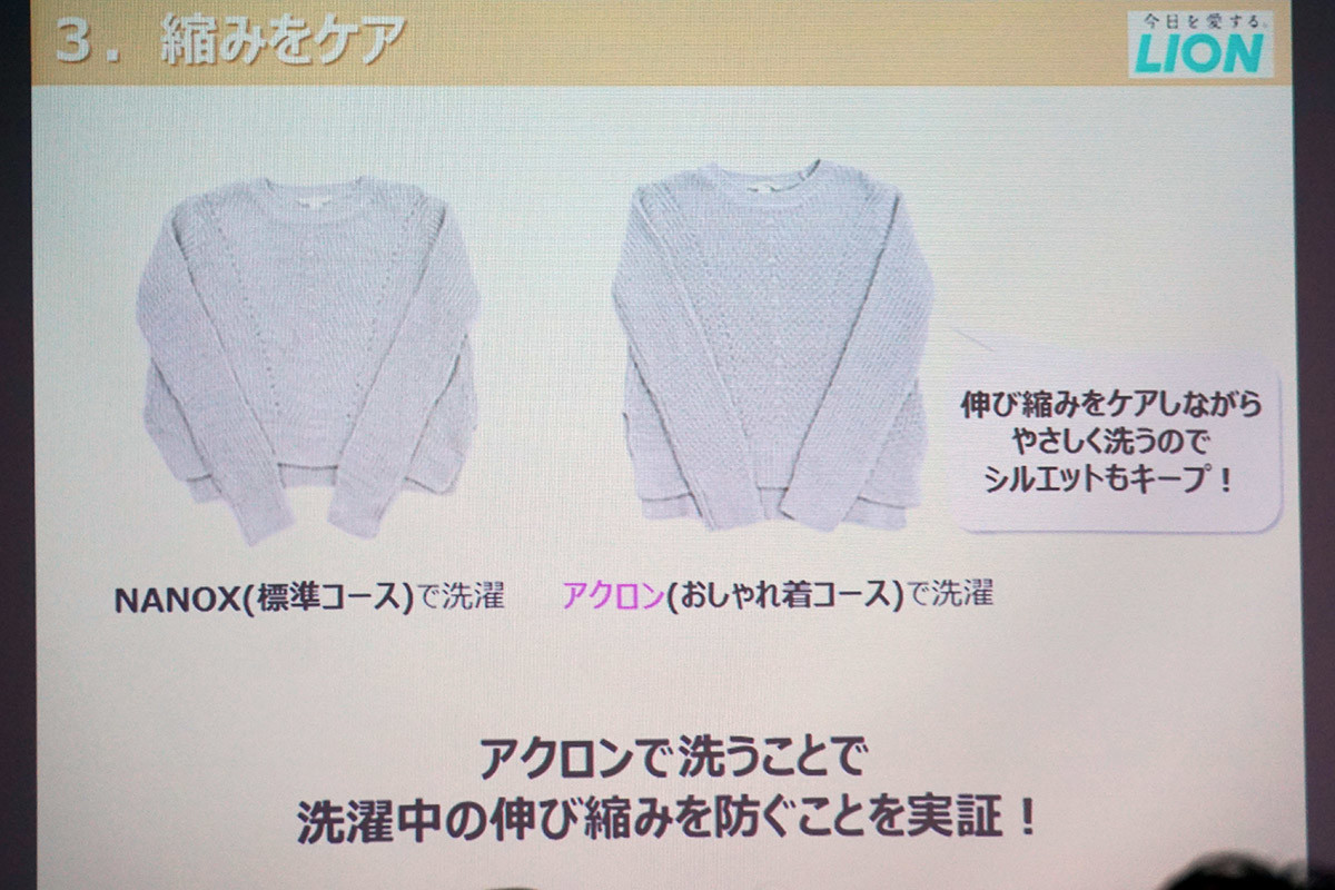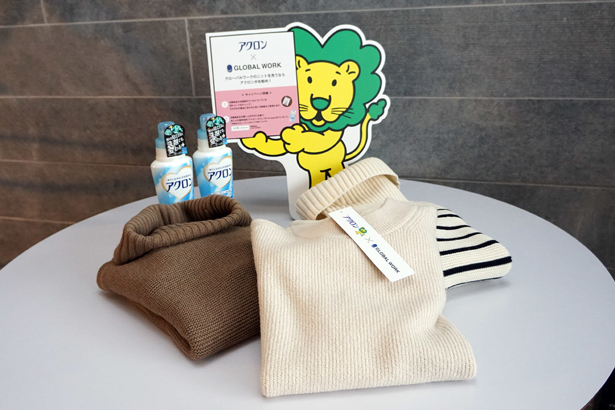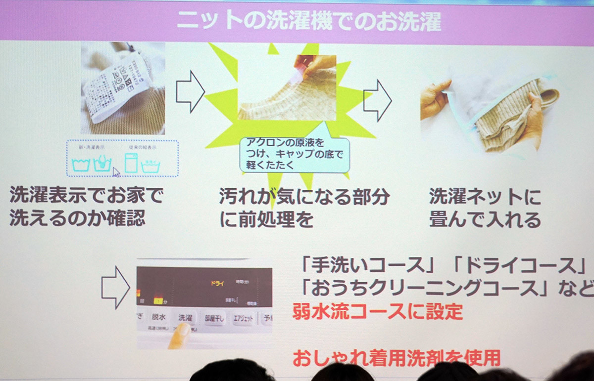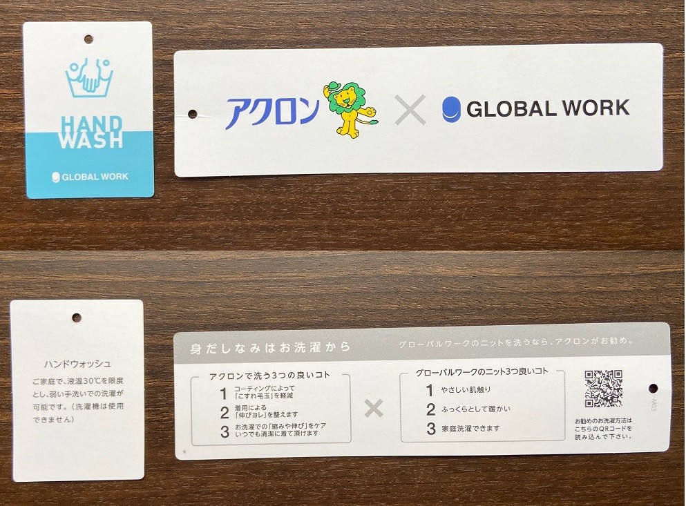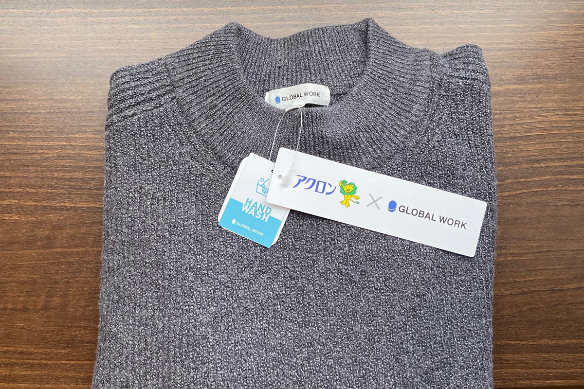 セミナー終了後、さっそく自宅でグローバルワークのニット製品をアクロンで洗ってみました。今回のコラボ製品は、洗濯機のおしゃれ着コースで洗えるものと、手洗いで洗えるものの2種類がありますが、こちらは手洗い推奨のもの。手洗いは洗いおけか大きめのバケツなどがあれば便利ですが、なければ洗面台のシンクに水をためて洗ってもOKです。