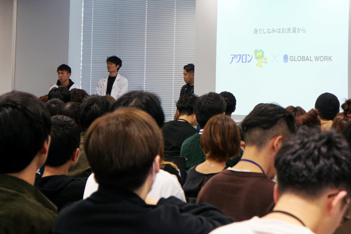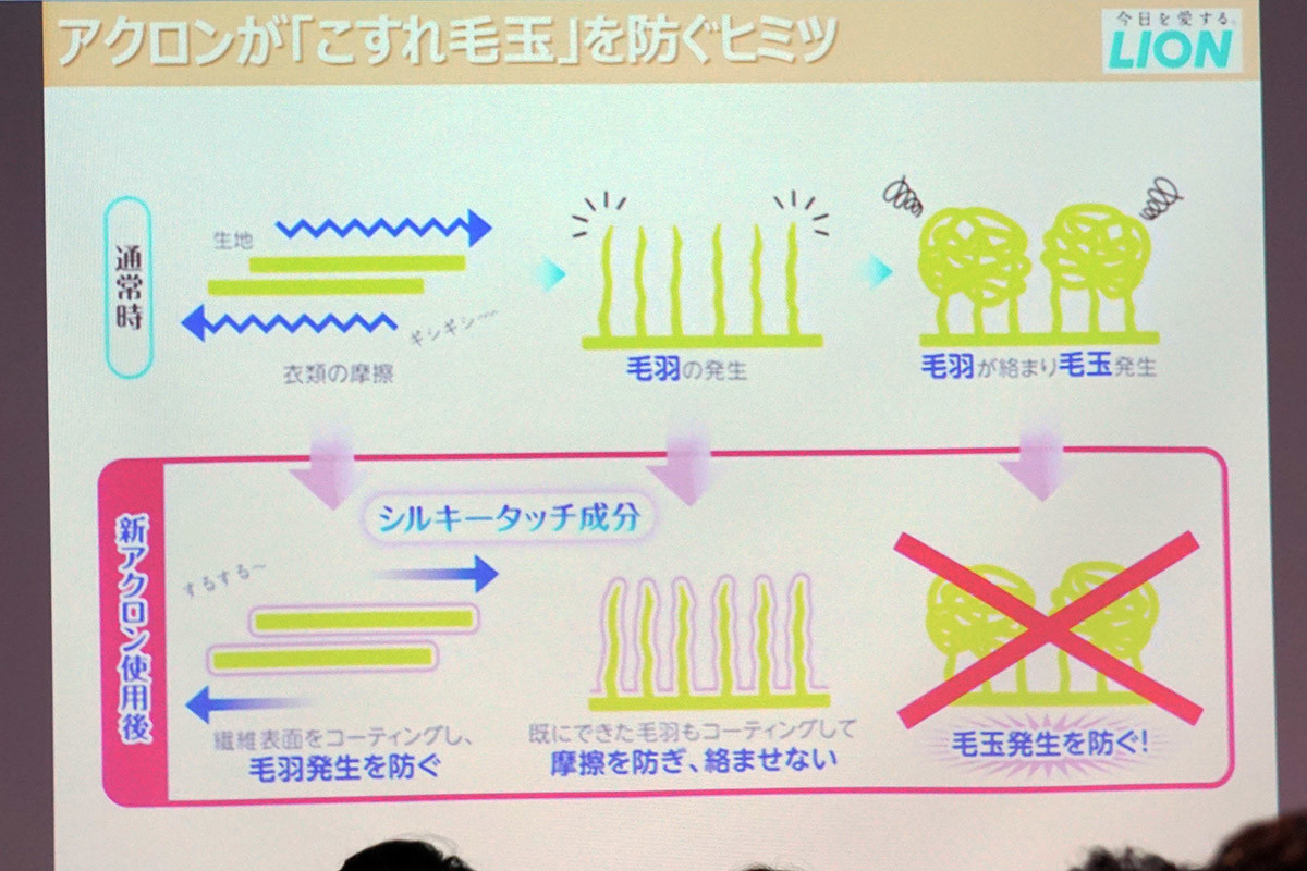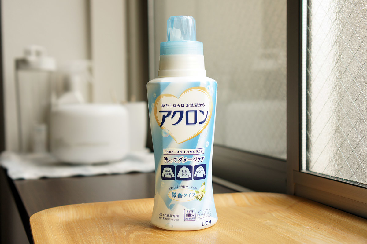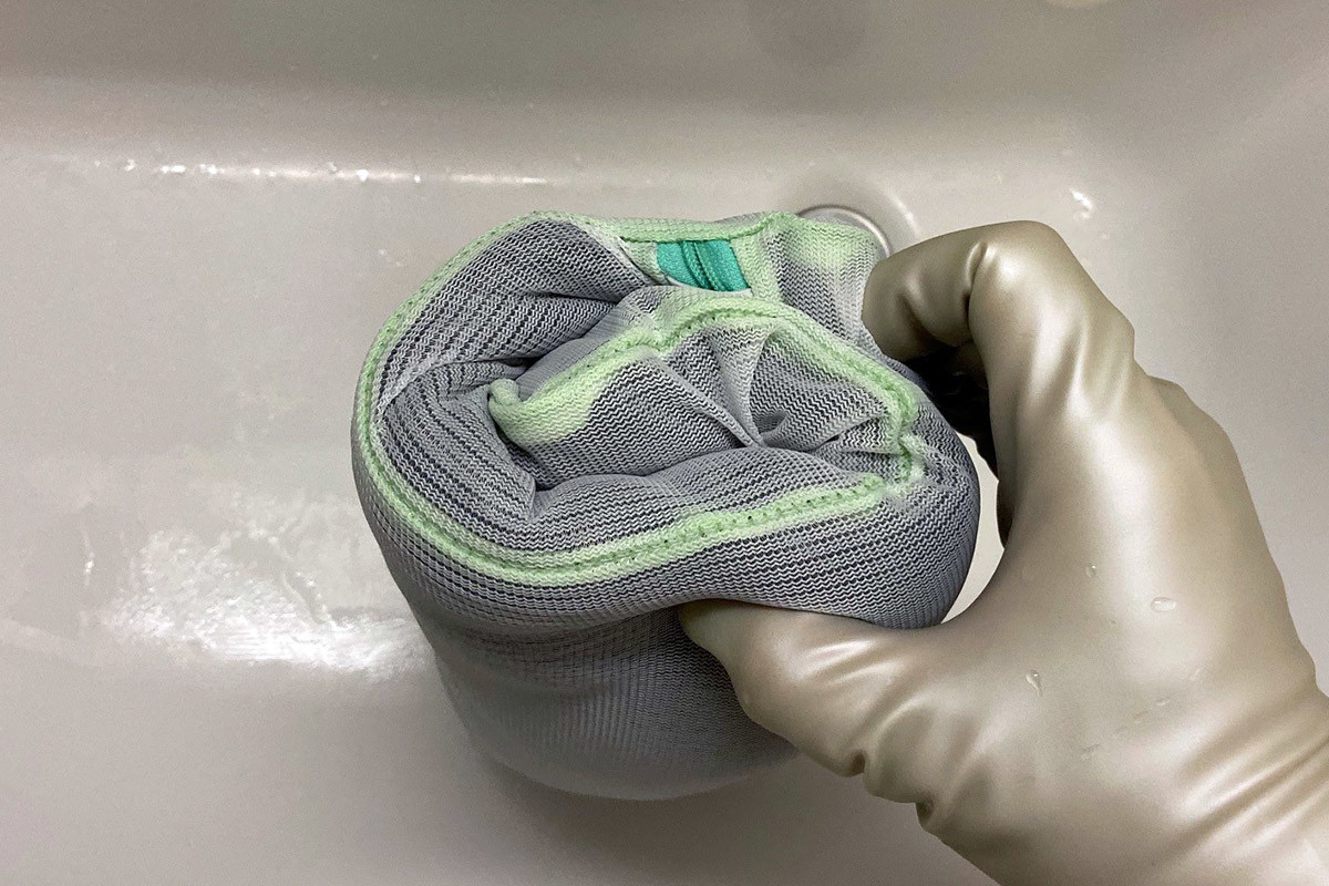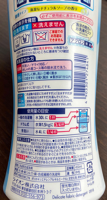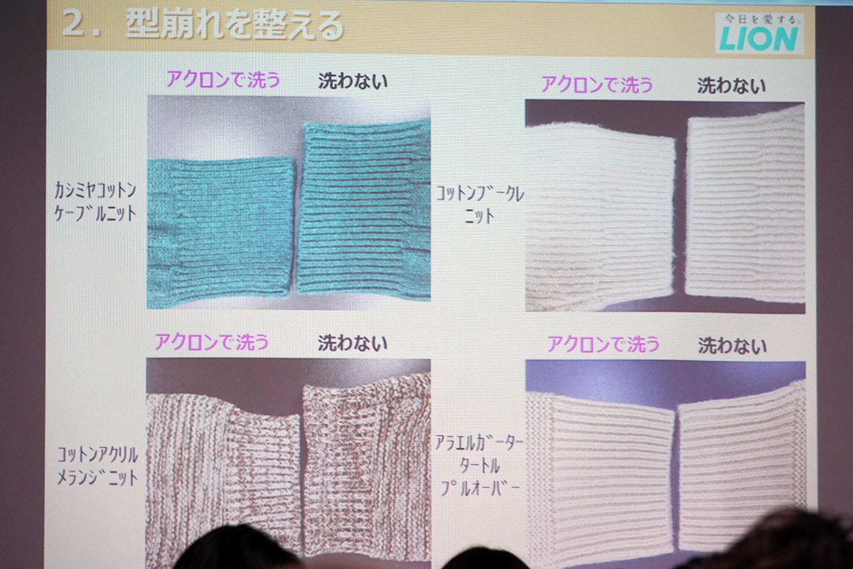 セミナー終了後、さっそく自宅でグローバルワークのニット製品をアクロンで洗ってみました。今回のコラボ製品は、洗濯機のおしゃれ着コースで洗えるものと、手洗いで洗えるものの2種類がありますが、こちらは手洗い推奨のもの。手洗いは洗いおけか大きめのバケツなどがあれば便利ですが、なければ洗面台のシンクに水をためて洗ってもOKです。