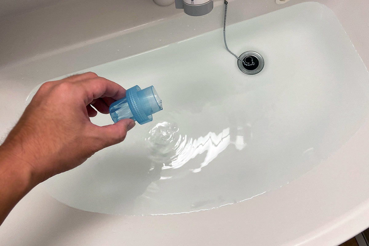 まず、洗面台のシンクに栓をして水をためます。このとき、30度以上のお湯を使うと繊維を痛めてしまう恐れがあるので、触って冷たいと感じないくらいのぬるめが適温です。水をためたらアクロンを適量投入します。軽くかき混ぜたら、洗濯ネットに入れたセーターを入れ、やさしく押し洗いします。時間は2~3分くらいでOK。