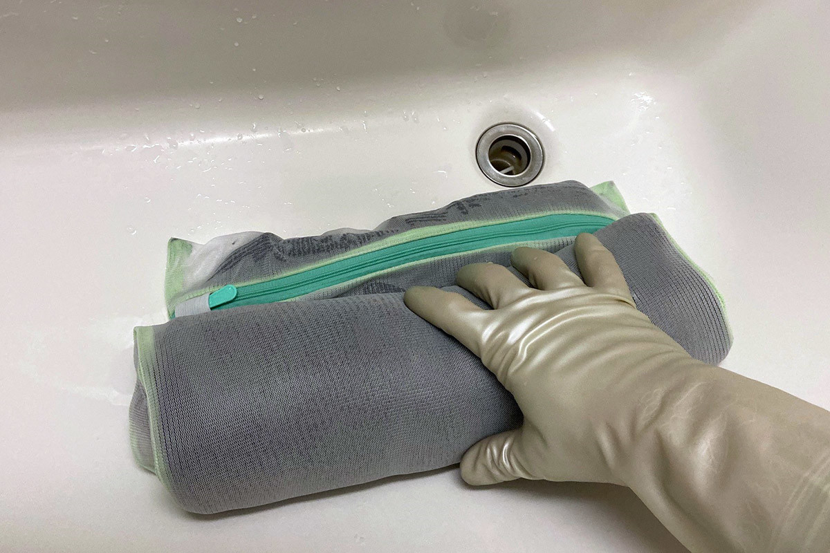 栓を抜いて排水したら、軽く脱水を行います。ネットに入れたままのセーターを、ロールケーキを作るようなイメージで端から丸めながらゆっくり押すようにしてしぼります。ぞうきんをしぼるようにひねったりねじったりするのは、繊維同士が絡まって毛羽や毛玉の原因になるのでNGです。