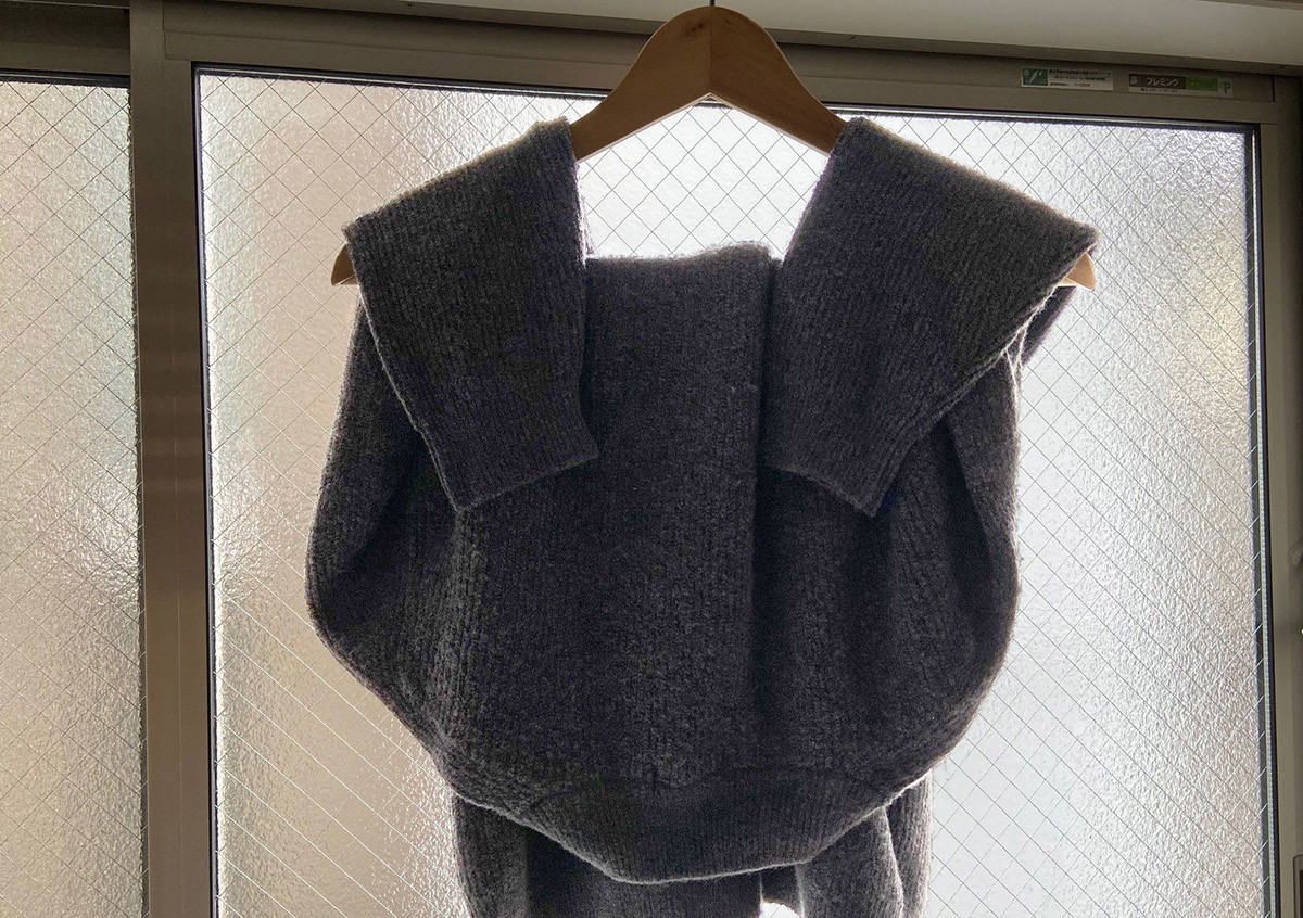 ニットは普通に干すと伸びてしまうので、干すときは平干し用ネットに広げて干します。平干し用ネットがない場合は、スーツ用などの横桟付きのハンガーで代用することも可能。まずセーターを横桟部分にセーターを半分に折るように掛け、腕の部分を腕木にかけます。このとき、プラスチック製のハンガーだと袖部分がすべり落ちてしまうことがあるので、その場合はハンガーの腕木にタオルを巻くと滑り止めになります。