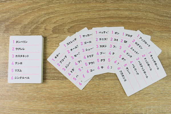 ゲームを始める準備として、まずはカードを全てシャッフルして裏向きのまま山札にします。じゃんけんなどで順番を決めたら、最初のプレイヤーは他の人に見られないように山札からカードを1枚引きます。手札にしたカードには、1~6までの数字とカタカナのワードがふられています。