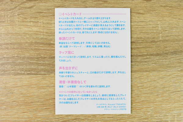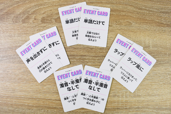 同商品にはカタカナが書かれたカード以外に“イベントカード”も入っています。“ラップ風に”や“濁音・半濁音なし”などの縛りがプラスされて、お題の難易度がアップ。どれも面白い制限ばかりなので、さらにゲームが盛り上がりますよ。