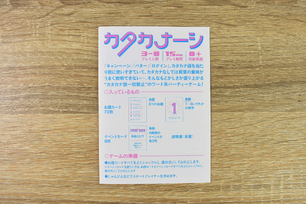 試しに引いてみたカードには、「イベント」「コンテスト」「トークショー」「セミナー」「キャンペーン」「サービス」という言葉が1~6の順番に並んでいました。次の山札の数字が「4」だったので、4番目の「セミナー」がお題となります。あとはスタートしたプレイヤーがカタカナを使わず、他のプレイヤーにお題を伝えるだけ。