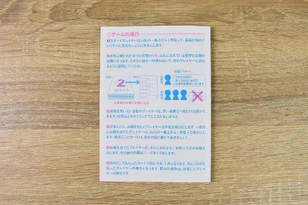 他のプレイヤーはお題を答えるだけでなく、カタカナを使っていないかもチェックしましょう。もしもカタカナを使用した時に指摘すれば、スタートプレイヤーの手札が自分の持ち札になります。