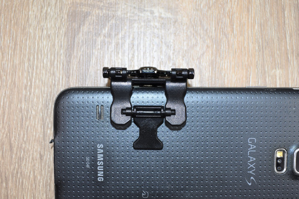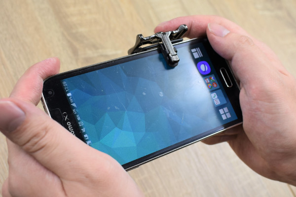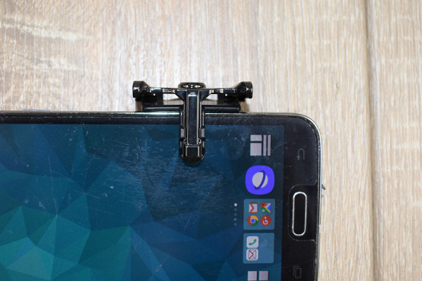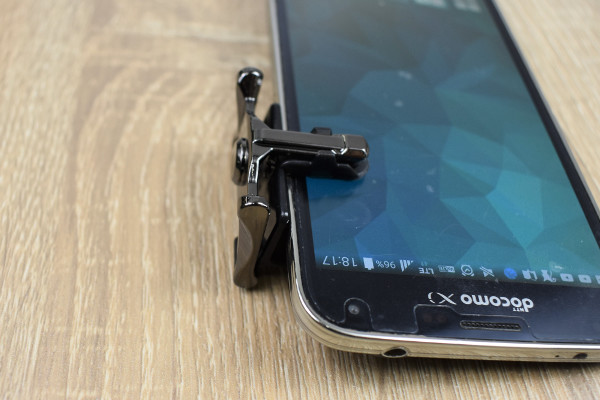 取りつけ方法はスマホの上部に同商品を装着し、ゲームのボタンに合わせて位置を調整するだけ。後はトリガーの丸いボタンを押せば、スマホ画面をタップできます。人差し指でプッシュしてみたところ、押し心地はかなり良好。タップし損ねることもなく、安定感バツグンです。まるでスマホをコントローラーのように扱うことができました。