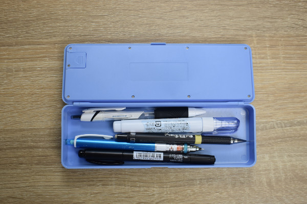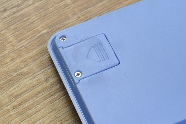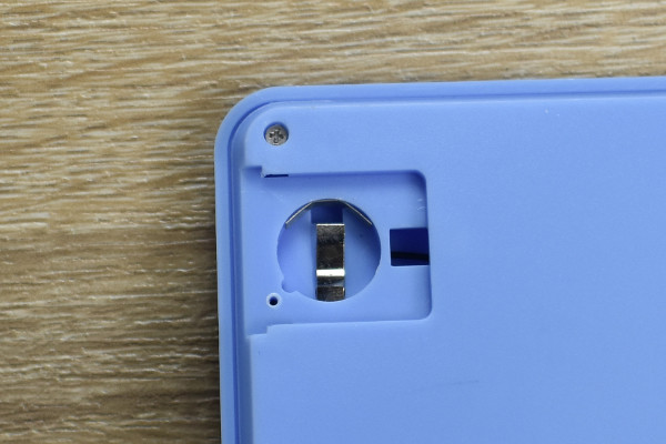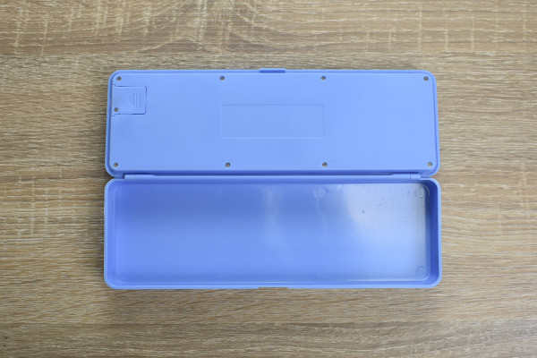 ブルーカラーの同商品は、ペンケースの蓋に電卓を搭載したアイテム。サイズは約19.5(幅)×6.7(奥行)×2.5cm(高さ)ほどです。蓋を開けると、シンプルな収納スペースがお目見え。蓋の裏側には電池カバーがついており、ネジを外せば電池を交換できます。なお、対応電池は“ボタン電池 LR1130(1.5V)”。