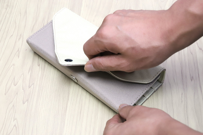 タテオキタイプも開ける瞬間が面白い。ジッパーを引いていくと、裏面側のフラップがパカリと自動で開くのである。これは中央にゴムベルトが仕込まれており、その張力が動力となっている。