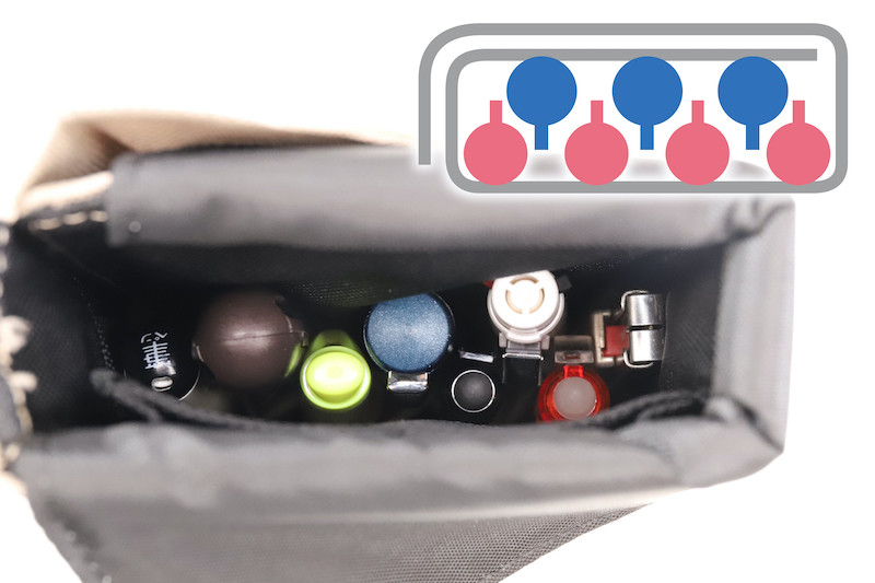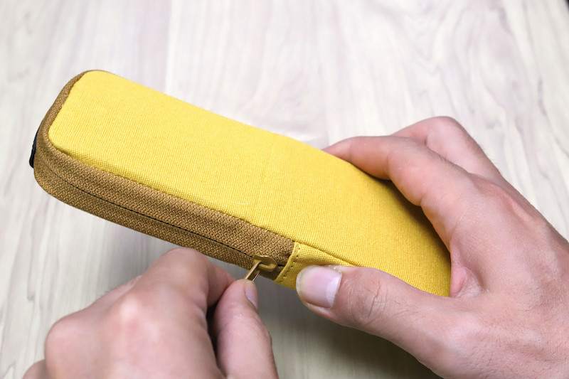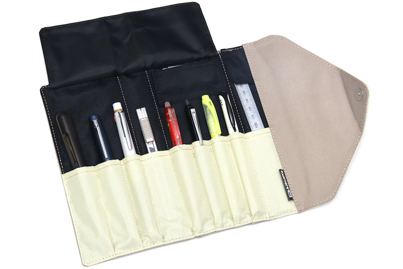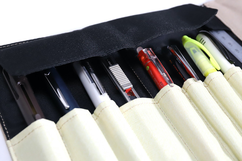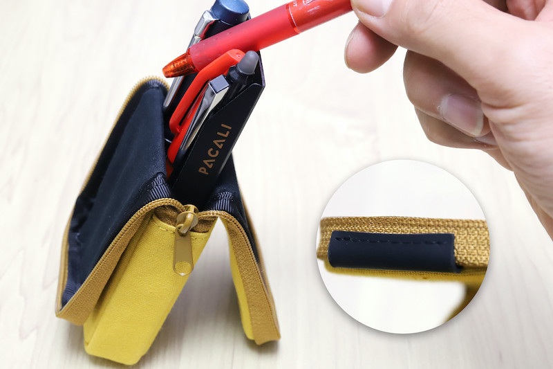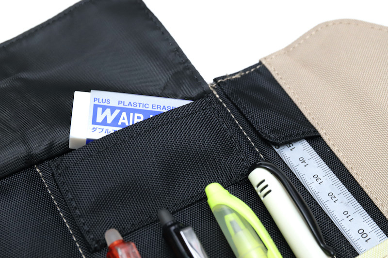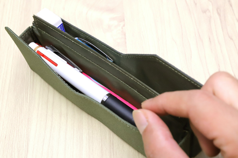 ただ、実際に使ってみると、収納内部の仕切り板がやや高く、ペンを取り出すのにちょっと邪魔だなー、というのが気になった。特に必要なければ、仕切り板はなしで使う方が軽快かもしれない。ただし、ペンなどを入れない状態で仕切り板を外すと、ゴムの力でペンケース自体が折れ曲がってしまうので、この点は要注意だ。