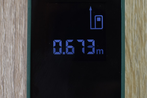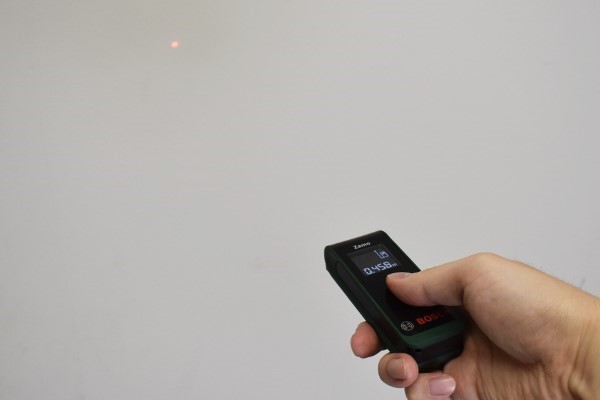 それでは、壁との距離を測定していきます。ディスプレイを起動させた状態でボタンをプッシュすると、先端からピカッと赤いレーザーが照射。壁にレーザーポインターのような真っ赤な点が現れて、「0.673m」とディスプレイ上に距離が反映されました。ちなみに0.15~20mまでの範囲はレーザーの光で測定できますよ。