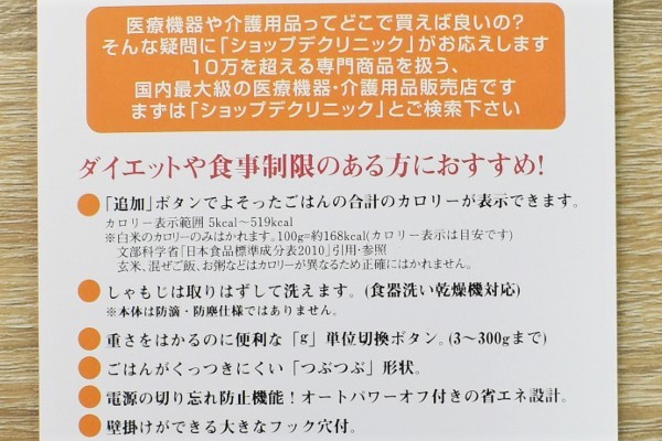 同商品が計れるのはカロリーだけではありません。持ち手の「切換」を押すと、ご飯のグラム数を計量することも可能。ちなみにカロリーは5~519Kcal、グラム数は3~300gまでが測定範囲となっています。玄米や雑穀米などはカロリー数が異なるため、正確に計量することができないので要注意。