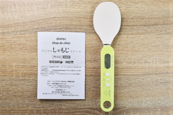 黄緑色のカラーリングが可愛らしい同商品は、約236(長さ)×60(幅)×26mm(厚み)ほどの大きさです。持ち手の部分にディスプレイが搭載されていて、通常のしゃもじより少し大きめな印象。リチウム電池によって起動しますが、“オートパワーオフ機能”を採用した省エネ設計となっています。