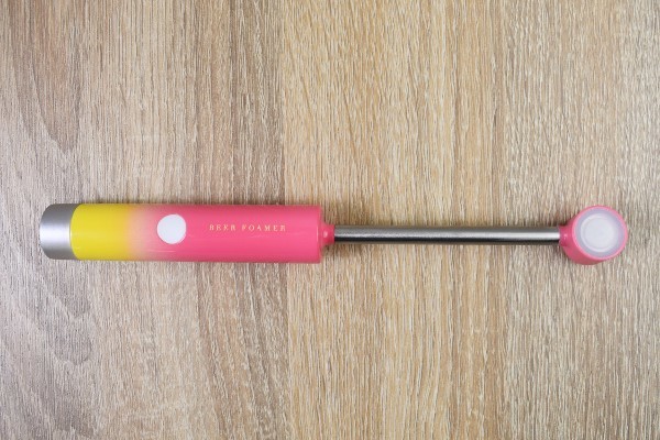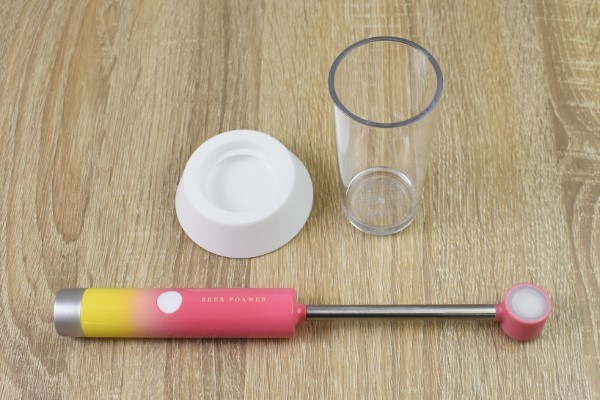 トロピカルな色合いがとても可愛らしい同商品。大きさは約24(横)×237.5(縦)×24mm(幅)、重量は約49gほどです。パッケージの中にはビールフォーマーの他に、透明なカップとスタンド用の土台が付属。カップを土台に装着すれば、ビールフォーマーを立てかけるスタンドに変身しますよ。