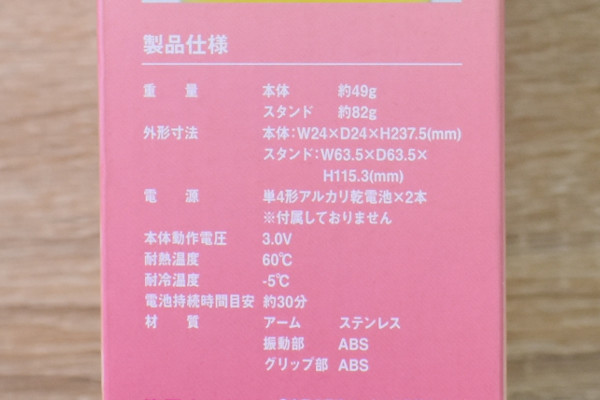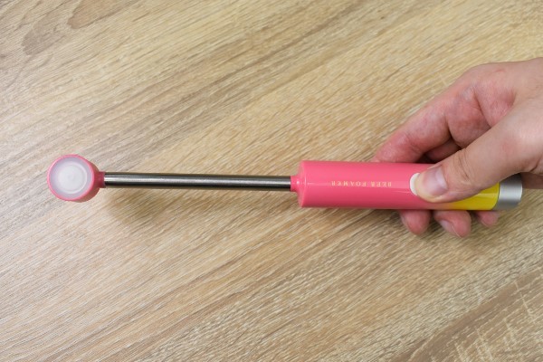 ビールフォーマーの先端は小さいトンカチのようなフォルムをしており、持ち手の部分にはスイッチが搭載されています。起動させるためには、単4形アルカリ乾電池が2本必要なので要注意。