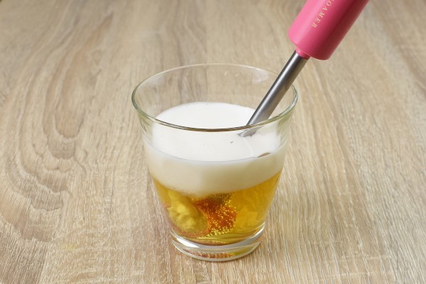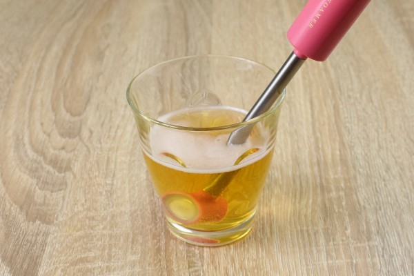 それでは、使い心地を実証していきましょう。泡を立てないようにビールをグラスへ注ぎ、スティックの先端をグラスに差し込んでスイッチをオン。押し続けている時だけ超音波が発生する仕組みで、少しずつキメ細かい泡がグラスに浮き上がってきます。まるでビールサーバーから出てきたようなクリーミーな泡を、スイッチを押すだけであっという間に作れました。