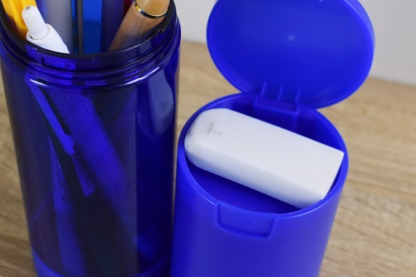 続いて鉛筆などを入れてみたところ、ペンの太さによって異なりますが約15本ほど収納できました。キャップには一般的なサイズの消しゴムが丁度よく収まり、収納力もいい感じ!