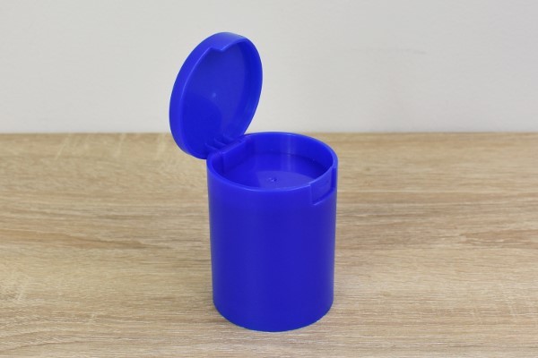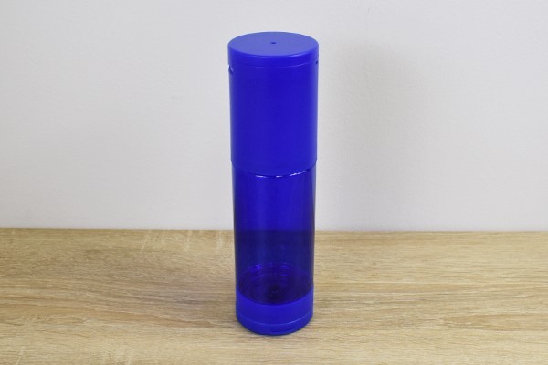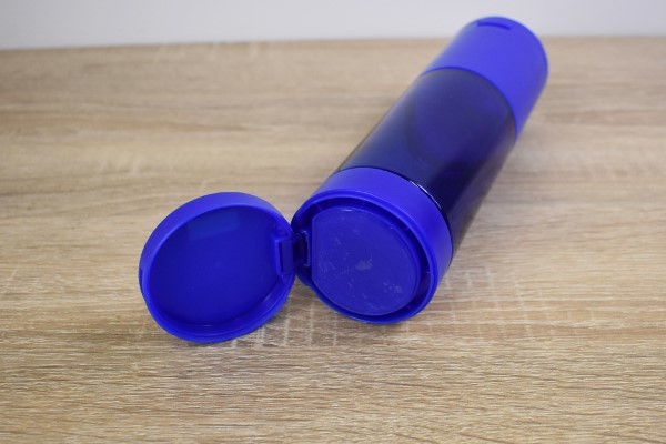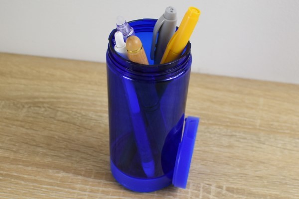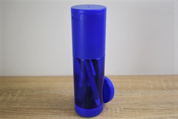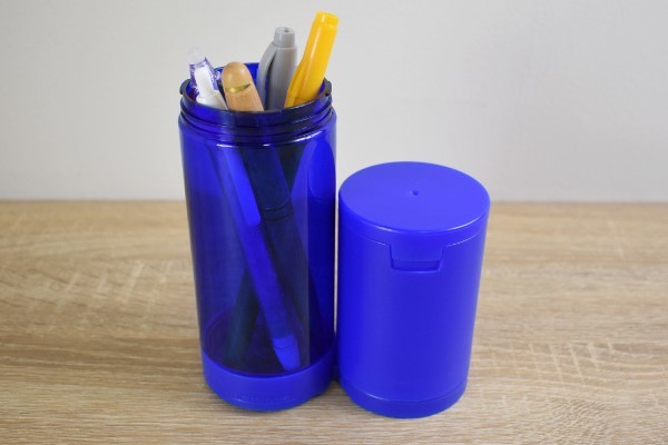 同商品は、水筒のような見た目をした円筒状のペンケース。サイズは約60(直径)×215mm(高さ)で、一般的なペンケースよりちょっと大きい印象です(小サイズもアリ)。中身が見えるように、ボディはクリアブルーのPET(ポリエチレンテレフタレート)が採用されていました。