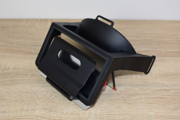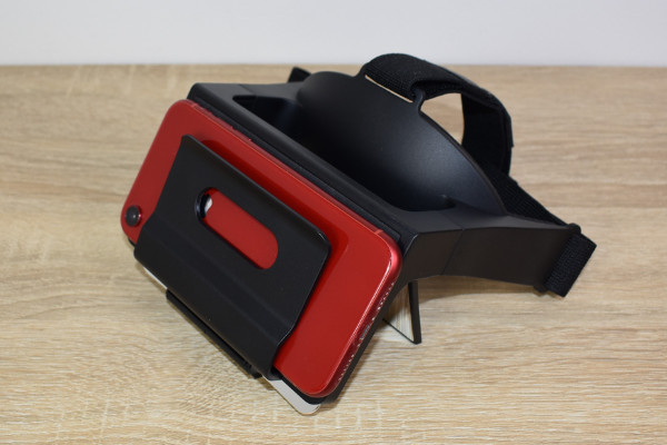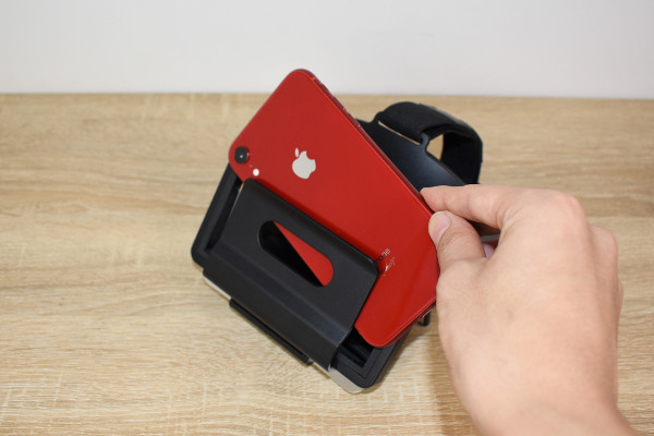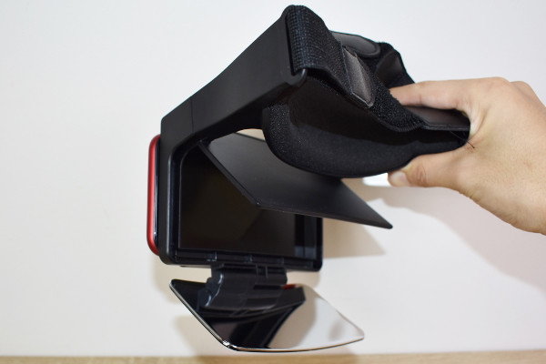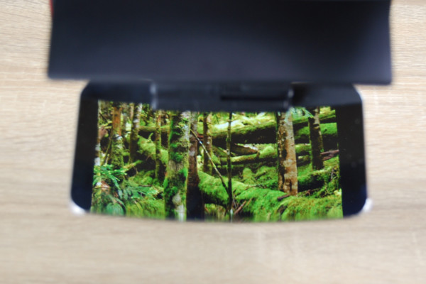 本体の構造で気になるのは、やはり2枚のミラー。通常ミラー(鏡像)と曲面ミラー(正像)がついています。どうやらスマホ画面を2枚のミラーに映し出すと、曲面ミラーで映像を見られるよう。ちなみにスマートフォンは本体のカバーにセットするだけでOK。スマートフォンのサイズは約125(長辺)×70×mm(短辺)以上、厚みは約10mm程度のものが対象です。