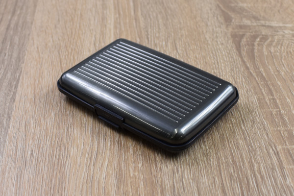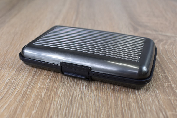長方形でメタリックなデザインの同商品は、ABS樹脂やアルミ合金などで作られたコンパクトなカードケース。衝撃に強そうな見た目をしており、表面のデザインはまるでキャリーケースを彷彿させます。サイズは約11(長辺)×7(短辺)×2cm(厚さ)ほどで、お尻のポケットやカバンに収納しやすいかも。