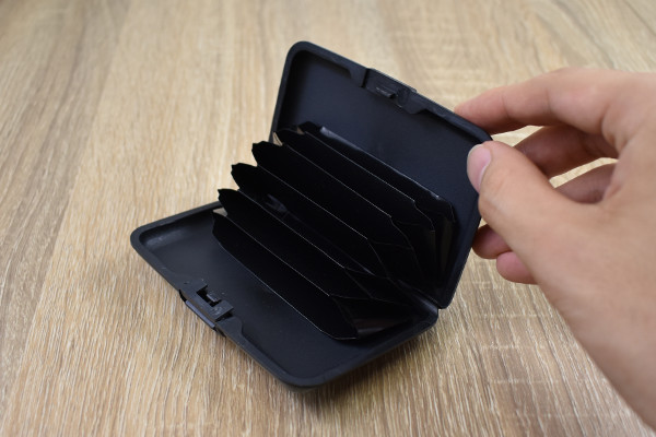 プッシュ式の蓋を開けると、塩化ビニル樹脂製の内ポケットがアコーディオンのように展開します。ポケットの数は全部で6か所。口が大きく開くため、スムーズにカードを入れられるはず。
