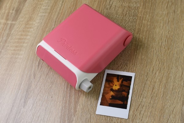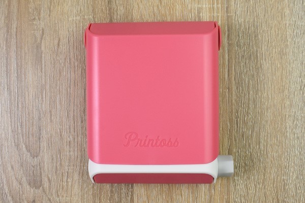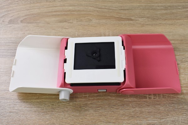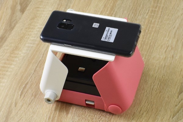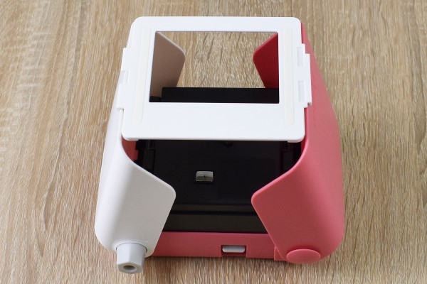 プリントスは、スマホ画面を直接撮影する組み立て式のチェキカメラ。バッテリーやスマホアプリなどは一切使いません。見た目は、ピンクと白色を基調とした可愛らしいデザインです。本体はABSなどのプラスチック素材で作られていて、サイズは約14.5(長辺)×13(短辺)×5cm(厚さ)程度で重さは約350gほど。