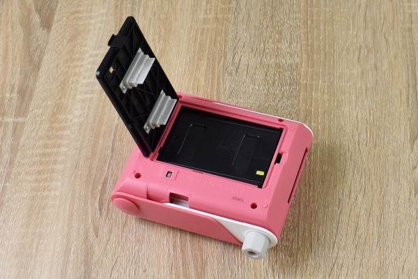本体の裏側にはフィルム入れを搭載。使用する際は、“富士フィルム インスタックスミニ(チェキ)フィルム”を入れてください。サイズが74×55mmのスマホ画面を、62×46mmのフィルムで撮影できますよ。