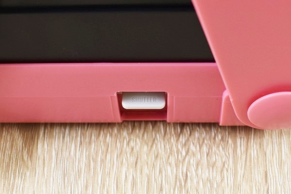 2つの“ウイング”を開くと撮影レンズが出現。レンズ周りにはデバイスフレームがついており、スライドさせることで取り外しが可能です。デバイスフレームを外すと、カメラの中ふたが自動でスタンドアップしました。