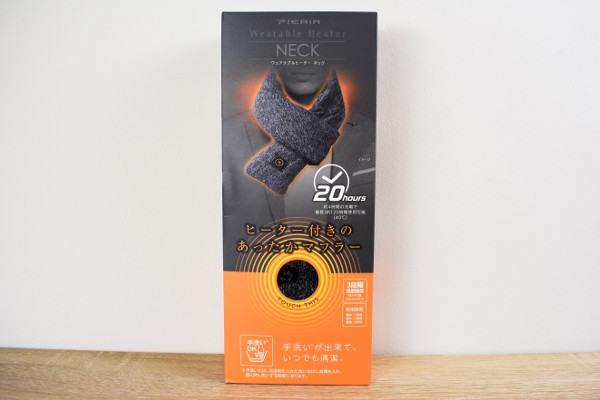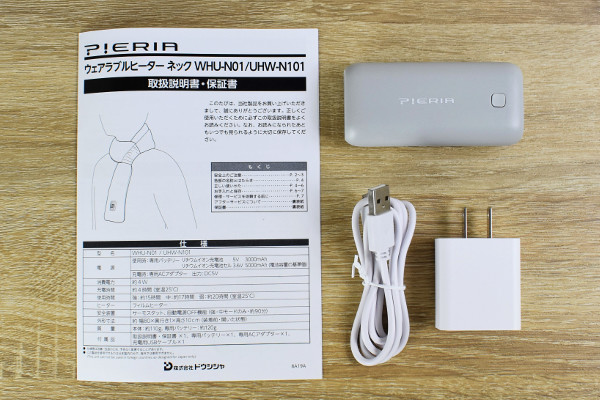 モコモコした手触りが特徴の同商品は、サイズは約80(幅)×10(高さ)×1cm(奥行き)、マフラーの重量は約110gほど。折り畳めばカバンなどにラクラク収納できそうですね。マフラーの他に、専用のモバイルバッテリーやACアダプター・充電用のUSBケーブルなどが入っていました。