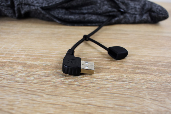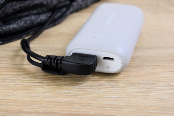 マフラーにはチャックがついており、開くと中からUSBプラグがお目見え。付属のバッテリーを繋ぎ、マフラーのスイッチをオンにするとヒーターが作動します。バッテリーは充電式となっているため、使用前にチャージするのをお忘れなく。