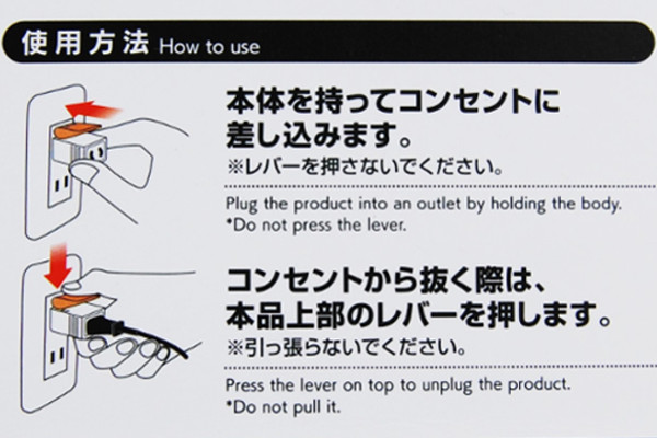 使用方法も至って簡単。アダプター本体をコンセントに差し込み、プラグを電源アダプターへ。コンセントから抜くときは、オレンジ色のレバーを押せば簡単に引き抜けます。実際に使ってみたところ、確かにレバーを押すだけで簡単にアダプターが抜けました。